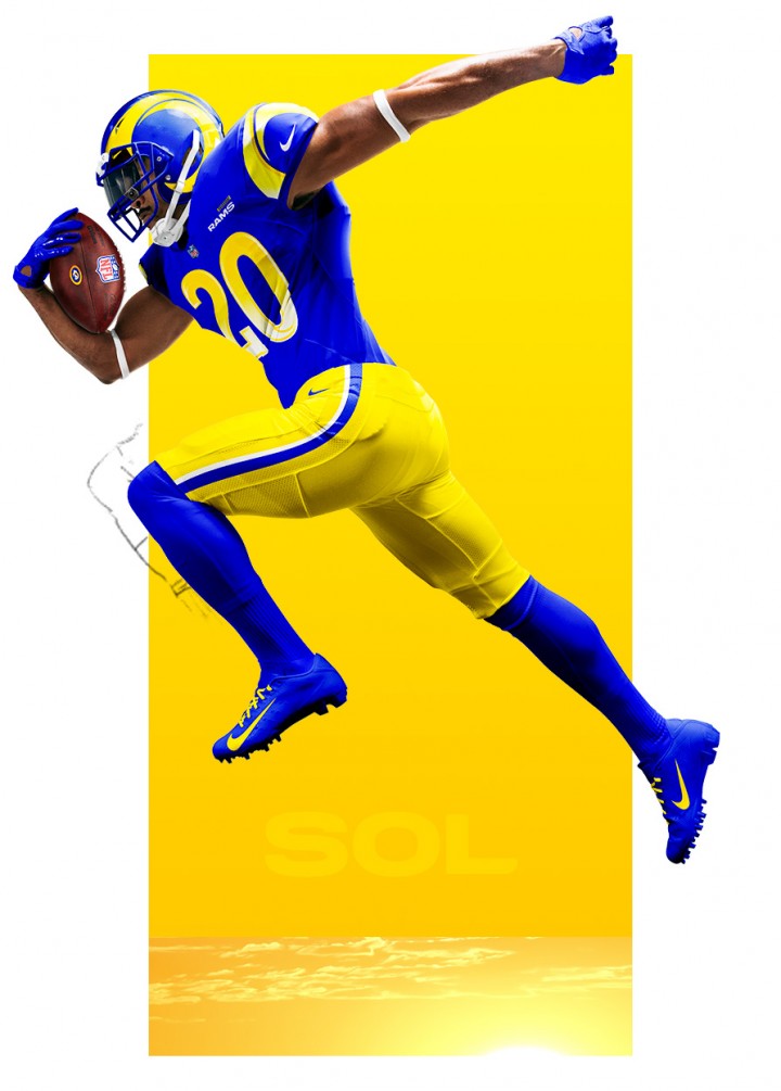 Now we get to the final of the three revealed uniforms for the 2020 Rams, and it’s far and away the biggest departure from both the previous set and anything we’ve seen in the NFL to date. Generally, teams have a team colored uniform they wear at home and a white uniform that is worn on the road (for most teams, yes I know Cowboys fans). As far as I can tell, this has been a thing since the NFL’s inception and was even written into the uniform rules, until now. The Rams had to once again apply for special permission to use a color other than white for the “white designated” uniform slot. I’m honestly glad they did. I’m a big fan of cream colored home uniforms in MLB (looking at you Cardinals), but that color doesn’t really work for the NFL. The grey uniforms used by the Seahawks are used similarly and don’t look bad, but these off-white (or Bone – again with the marketing babble) uniforms have really grown on me as I continue to look at the set. For one, no gradient! The blue numbers really pop off the “bone” uniform and I’m glad the team didn’t make some sort of corny blue/yellow or blue/white gradient on these numbers as well. This uniform does have a bit of that leotard look, but I’m guessing they’ll be able to be paired with the blue or yellow pants as well, so we could have some pretty interesting combinations for the future out of this uniform. I’ll be curious to see if this sticks, or we see it replaced with a standard white set in the near future. This happened with the Arizona Diamondbacks in MLB; they tried to go with a much darker than standard gray for their road uniforms. After much backlash from the fans, it was altered back to a more standard gray for the upcoming season; a net loss in my eyes.